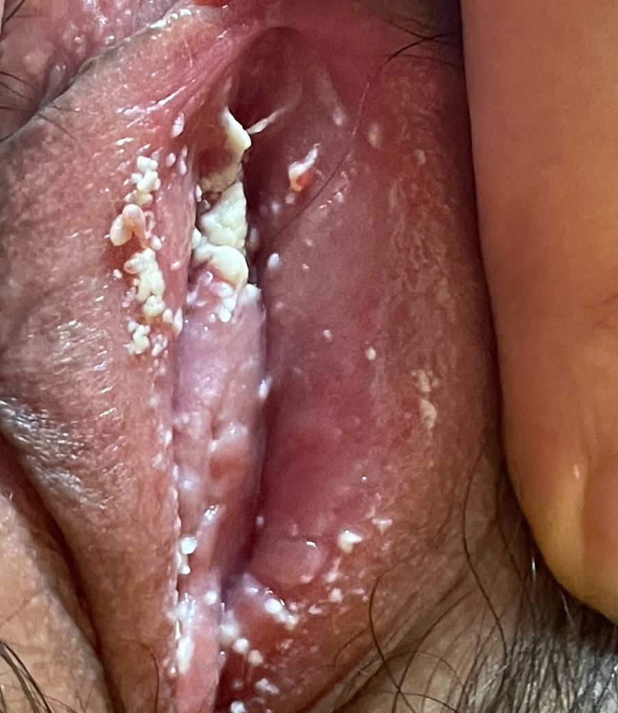 소음순으로 추정되는 부위에 흰색의 삼출물과 작은 융기성 구진들이 관찰되어 질염으로 인한 점막 부종 가능성이 높습니다. 이러한 경우 질염에 대한 치료를 먼저하고 상기 병변이 호전되는지 확인해 보아야 합니다. 만약 질염 치료 후에도 상기 병변이 의심된다면 성매개성 피부 질환에 대한 검사와 진료가 필요하므로 산부인과 진료늘 보시는 것을 권해드립니다.