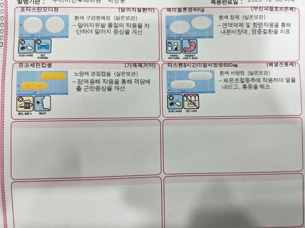 사진 약들은 성분이 서로 겹치지 않아 감기약과 전립선약을 함께 복용해도 무리는 없습니다. 다만 로나펜정과 타스펜서방정은 둘 다 진통·해열제라서 위가 예민하면 꼭 식후에 드시는 것을 권장드립니다. 포타스틴정과 비유피-4정은 항콜린성 작용이 겹쳐 입마름과 변비가 심해질 수 있으니 증상이 불편해지면 말씀해주신 병원에서 조정받으시면 됩니다. 전체 조합은 일반적으로 안전한 편이며 어지러움이 있을 수 있어 운전은 잠시 피하시는 것이 좋습니다. 감사합니다.