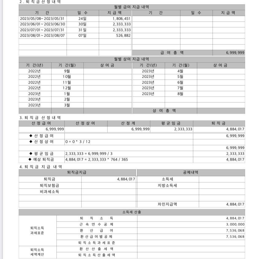 여기서 퇴직금은 얼마라는 건가요? 계산서만 받아서 모르겠습니다...퇴직금을 얼마 받아야한다고 신고해야하는데