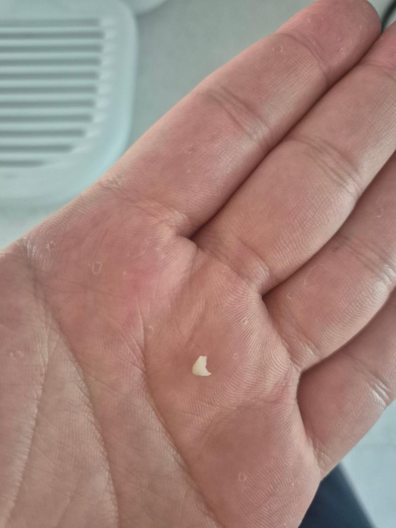 사진으로 봤을 경우에는 레진 조각일 수도 있지만 치아가 깨진 것일 수도 있습니다. 정확한 확인을 위해서 치과에서 진료를 받아보는 것이 좋을 것으로 생각됩니다.