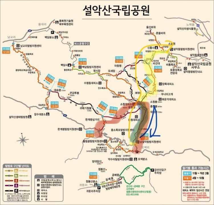 사진 속 노란색 코스는 오색(녹음정)코스라고 불리며, 대청봉으로 오르는 왕복 코스로 약 4.2km의 거리를 가지고 있습니다. 초보자도 간단하게 따라갈 수 있으나, 대청봉으로 오르는 구간에서는 경사가 가파르고 바위길이 많아서 발을 조심해야 합니다. 또한, 등산 준비물과 체력에 대한 충분한 고려가 필요하므로, 등산 전에는 반드시 준비사항을 체크하고 숙지하시는 것이 좋습니다.