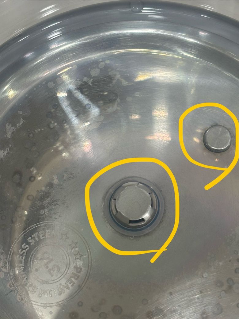 무지개 자국은 스테인리스 제품에서 자주 생기는 산화막 때문에 생기는 현상이라서 세척을 해도 남아 있는 경우가 많습니다. 식초로 끓이는 방법도 좋지만 완전히 없어지진 않고 기능에는 큰 영향이 없다고들 해요. 표시된 부분은 사진상으로는 부식이나 긁힘보다는 단순한 얼룩처럼 보여서 사용에는 문제 없어 보입니다. 그래도 찝찝하시면 베이킹소다나 구연산으로 한 번 더 세척해보시는 것도 괜찮습니다. 저도 예전에 비슷한 자국 보고 걱정했는데 그냥 쓰다 보니 신경 안 쓰게 되더라고요.