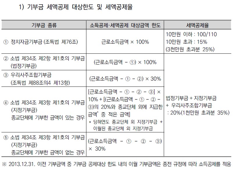 거주자(근로자 본인) 및 기본공제를 적용받는 부양가족(나이의 제한을 받지 않음)이 해당 과세기간에 지급한 공제한도 내의 기부금의 20%(1천만원 초과분 35%)은 해당 과세기간의 합산과세 되는 종합소득산출세액에서 공제한다. 단, 정치자금기부금의 경우 10만원 이하분은 해당 과세 기간에 지급한 기부금의 100/110에 해당하는 금액을, 10만원 초과분은 15%, 3천만원 초과분은 25%를 해당 과세기간의 합산과세되는 종합소득산출세액에서 공제 합니다. (2013년 기부금액 중 이월된 기부금액은 소득공제 적용)
