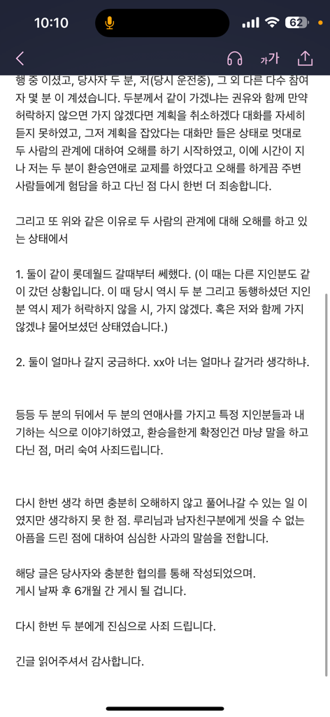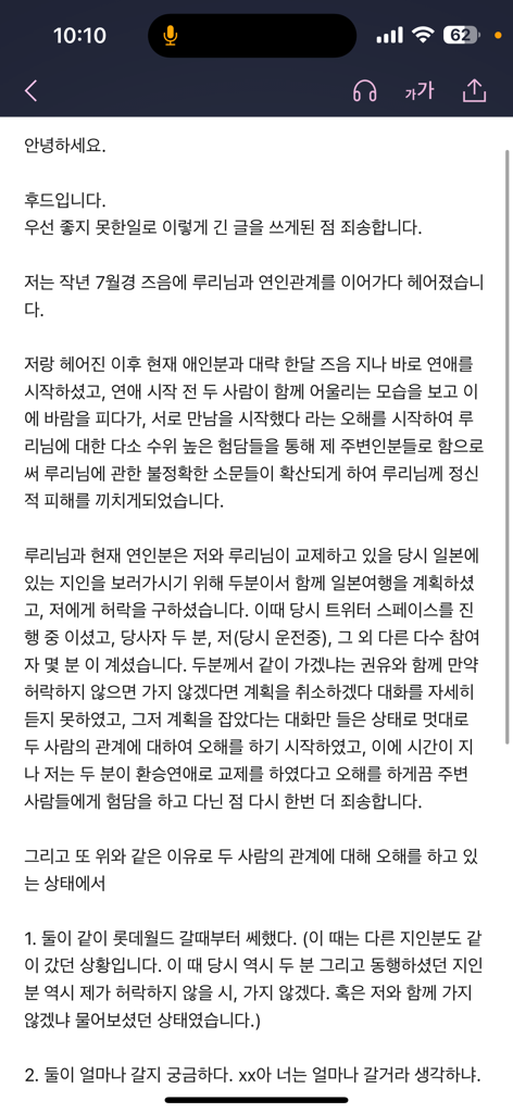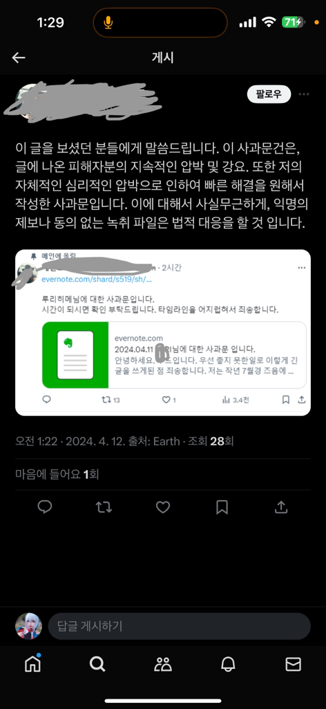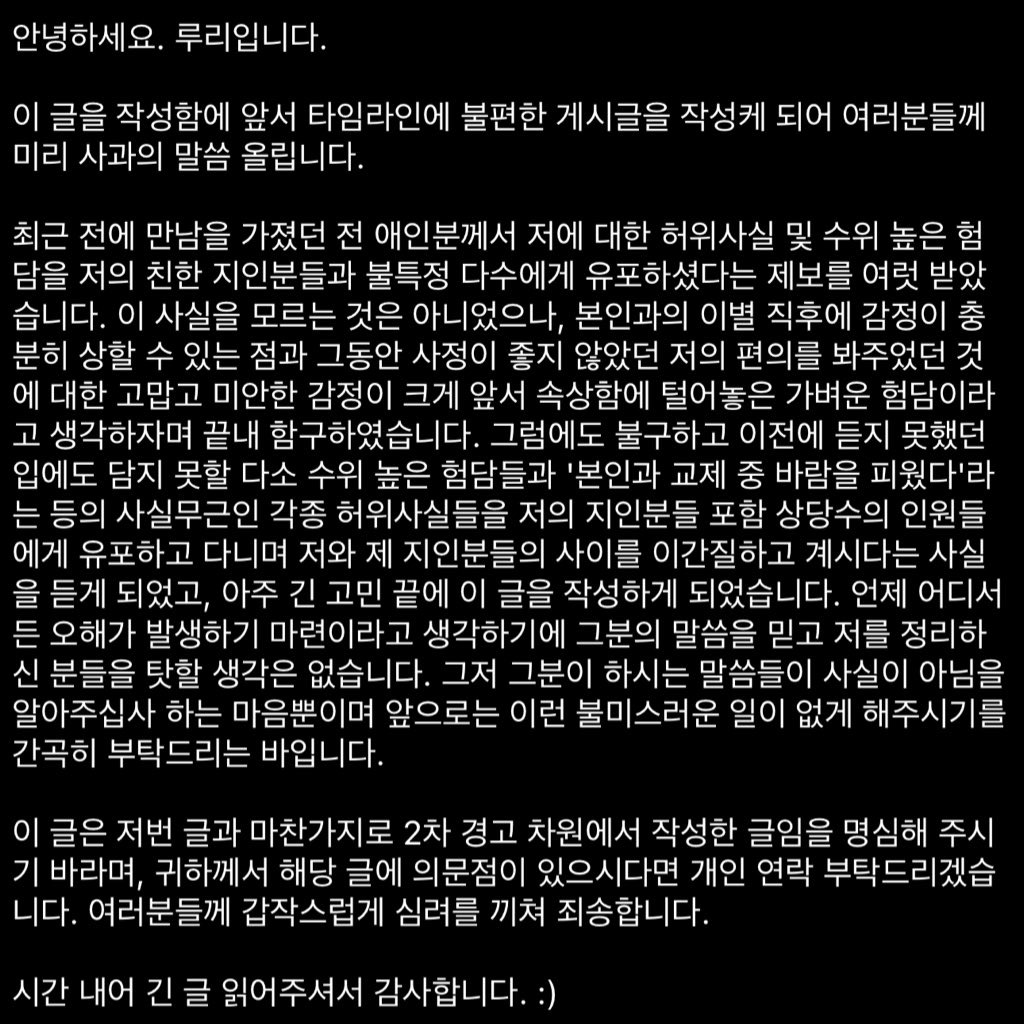 그래도 헤어졌으니 감정이 좋지는 않겠지 싶어 그냥 모른척 해주었고 이후 심각한 수준의 성희롱(신체 특정부위 비하, 잠자리를 가진 상세내용과 험담)과 저와 전남자친구가 만날 당시, 현재 만나고있는 남자친구와 바람피워서 만났다는 등의 허위사실을 저의 지인들과 불특정 다수들에게 유포하고 다닌다는 사실을 확인했습니다. 그리고나서 내용증명을 보낸 후에 트위터에 인물을 특정하지 않은 저의 입장문을 먼저 게시했고 (첫번째 사진) 후에 당사자에게 연락이 와 사과를 받았습니다. 그 과정에서 내용증명에 작성 되어있는 대로 사과문을 부탁했으나 '50만원으로 어떻게 안되겠냐'라며 합의를 제시하였고 이를 거절하며 사과문 작성을 재요청 했습니다. 이후 사과문의 예문을 보내며 '이렇게 올리면 되냐'고 보여줘가며 사과문을 작성해 나갔는데, 내용이 너무 부실한데다가 사과의 뜻이 담긴 내용이 거의 보이지 않아 수정할 것은 2~3차례 정도 부탁하였습니다. 하지만 나아지는게 없었고, 더이상 수정 요청을 계속하면 상대방이 불쾌할 것이라고 여겨 '그냥 내가 사과문 트윗을 인용해서 내용보충하겠다'라고 이야기한 후 트위터에 올라온 사과문을 인용하여 부족한 내용들을 보충하고 정정하는 내용들을 적었습니다. 저는 좋게 끝나서 참 다행이라는 마음 뿐이었지만 정정 인용트윗 4번(성적 발언에 대한 사과글 추가요청)글을 보고 상대방의 태도가 돌변하여 '나는 그런적이 전혀 없다. 니가 허위사실을 유포했으니 법적대응을 하겠다'라며 현재 사과문을 삭제 후 2번 사진과 같은 게시글을 올렸습니다. 카톡으로도 통보받은 상태이며, 진짜 죽고싶습니다...저는 전남자친구의 하대와 폭언에 지쳐 헤어졌었고 한달 후에 좋은 만남을 가지게 되어서 행복한 나날을 보내고있던게 전부입니다. 어떻게 같은 사람이면서 이렇게 잔인할 수가 있을까요...? 이 때문에 일상생활이 무너져 정신과 약도 복용하고있습니다...약 없이 생활이 불가능합니다...현재로서 제가 법적으로 많이 불리할까요? 제보자 친구들도 익명성 보장을 원해서 쉽게 도와주지 못하고있는 상황입니다...그리고 법적대응시 필요한 것, 취해야 할 자세, 행동 등등 제가 지금 할 수 있는것들과 필요한 모든 것들을 알려주셨으면 좋겠습니다. 꼭 도와주세요...정말 피해자가 죽어야하는걸까요... (마지막 2장은 받았던 사과문입니다.)