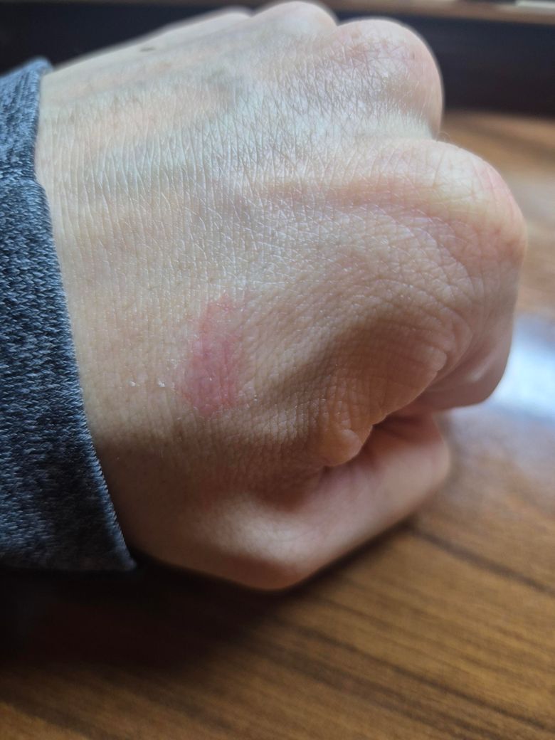 제가 뜨거운 커피를 흘려서 손에 데였거든요 1달 지났고 통증도없고 아무것도 없는데 이렇게 약간 검붉은 색깔이 되었는데 여기에 노스카나겔 바를까요? 아니면 중증아토피가 있는데 프로토픽을 바를까요?