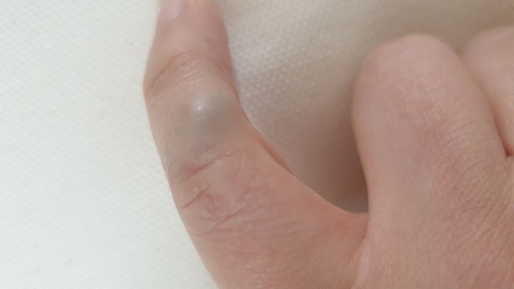 사진의 소견으로 보았을 때에는 손가락 피하혈종 같은 질환이 생겼을 가능성이 높아 보입니다. 진료를 위해서는 피부과 혹은 수부 진료를 보는 성형외과에서 진료를 보시고 치료를 받으시길 권고드립니다.