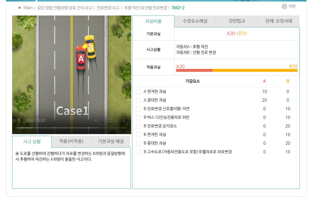 그러나 차선변경중 발생한 사고에서 상기처럼 구체적 사실관게에 따라 과실이 조금씩 다르게 산정되긴 하나