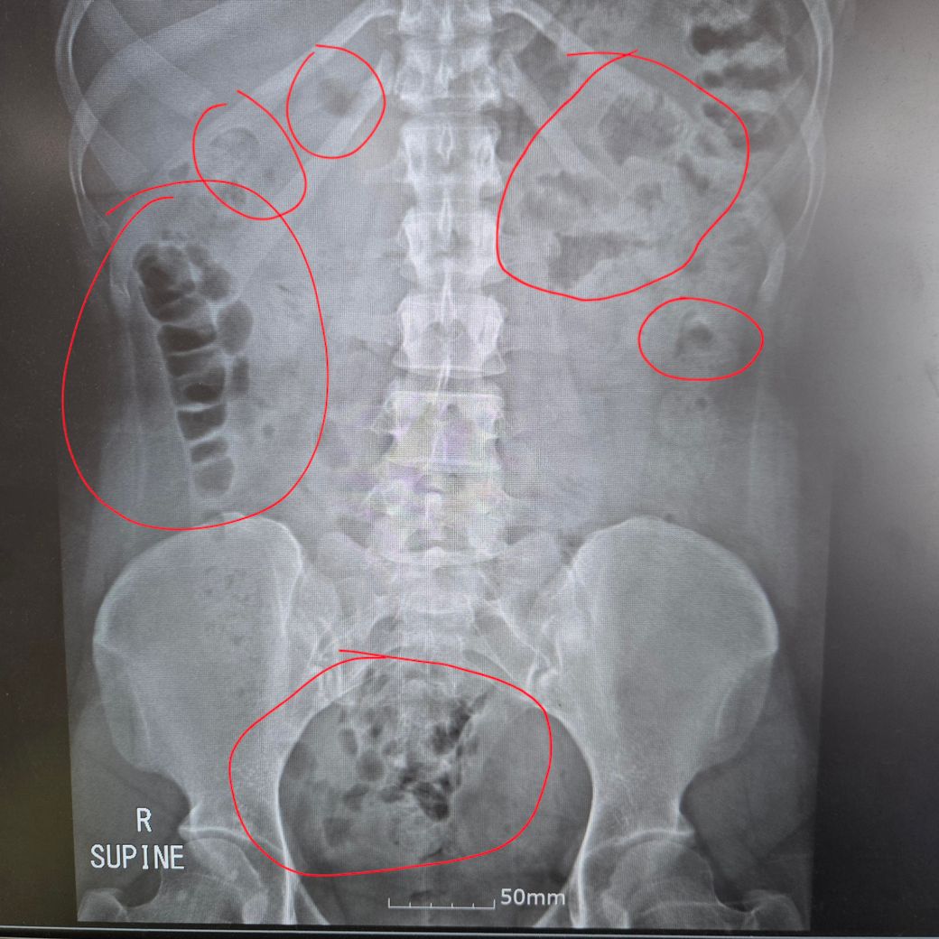 사실 복부 X ray 로 자세한것을 알기는 어렵긴 합니다. 가스와 대변이 대장에 있는것은 원래 당연한 거고,, 별로 특이소견 없어보이네요