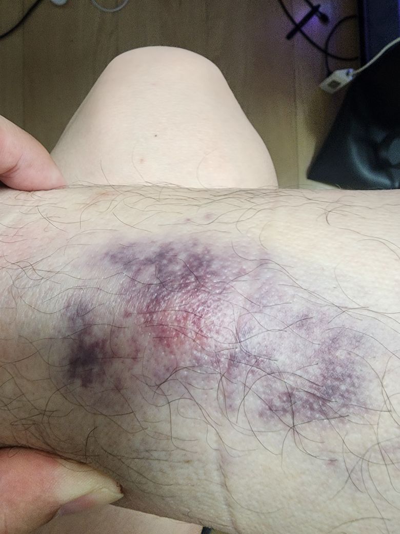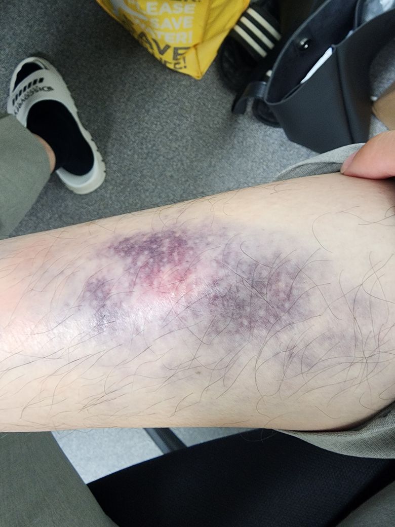 지금은 붓기는 다 빠졌고 걷는데 지장이 없으며 통증이 거의 없이 멍만 저렇게 남아있는데
