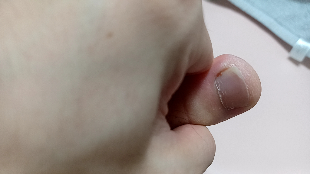 엄지발톱과 부은 왼쪽 살 점 사이에 살짝 튀어나온 것은 발톱인데요, 원래는 전체 발톱에 왼쪽 꼭지점 부분이 조금 튀어나와 있었는데 그 튀어나온 부분을 손으로 직접 잘라서 떼어 내려고 했는데 발톱의 왼쪽 변 부분이 얇게 찢어지면서 그 찢어진 부분이 저렇게 발톱과 왼쪽 살점 사이에 끼어있는 것처럼 튀어 나오게 됐어요. 사진에는 튀어나와있는 발톱이 짧은데 그건 제가 원래 길게 찢어져서 튀어나온 발톱을 가위로 잘라서 짧게 보이는 거에요.