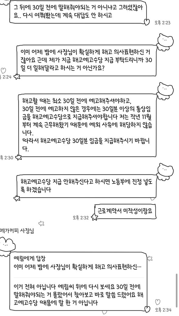 저는 메가커피에서 작년 11월16일부터 올해 11월 6일까지 근무하였습니다 사장님이 갑작스럽게 11월 6일 저녁에 해고하셨고 그걸로 노동부에 가서 해고예고수당으로 진정서를 넣었습니다 그런데 감독관으로부터 받을 수 없다는 답변을 받았습니다