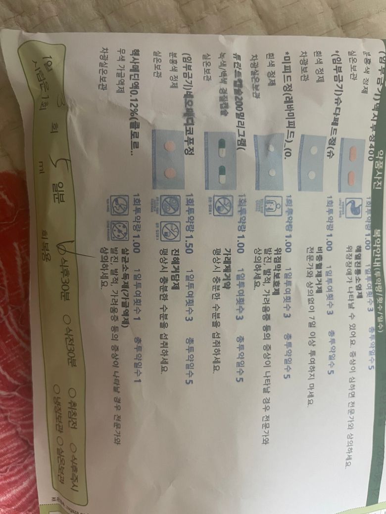 처방받으신 약중 소염진통제,비충혈제거제,진해거담제등은 과용량시 위장장애,심계항진.혈압상승.어지러움등 부작용이 있을 수 있기에 몇시간은 관심있게 지켜보시길 바랍니다.