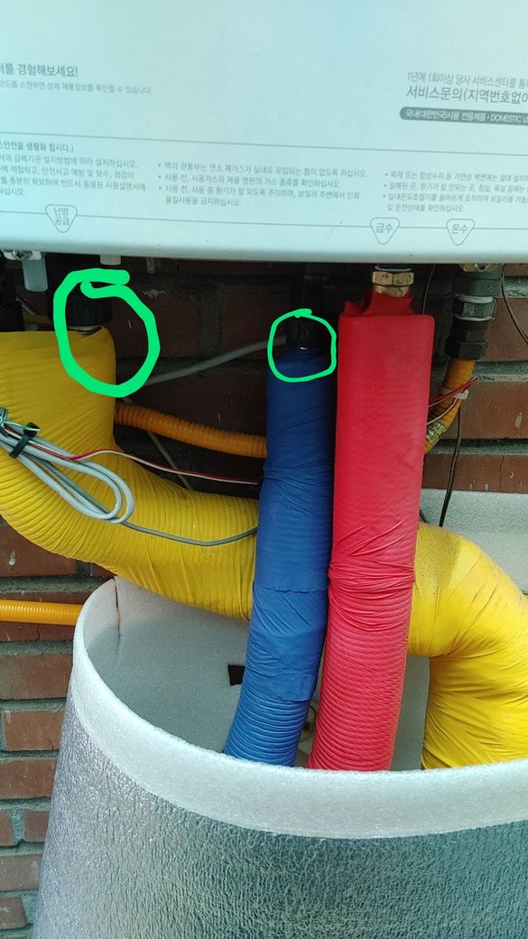 설비 업체 기사분이 방문해서 저희집 가스보일러 배관~보온재 씌우고 테이프까지 감아주고 가셨는데 몇일 지나서 자세히 보니까 표시 부분 2곳이 보온재가