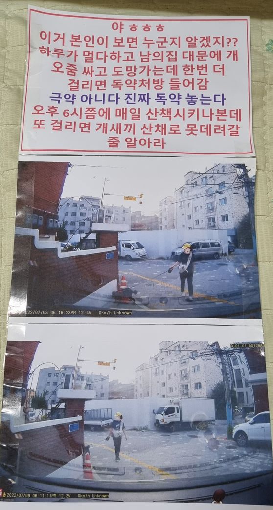 너무 스트레스여서 블랙박스로 영상과 사진을 땃는데 이거 저희집 대문에 경고문구로 이렇게 붙여두면 협박죄가 되나요?