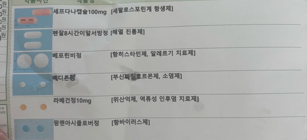 처방받으신 약들 중 세프다나캡슐이나 펜잘8시간이알서방정, 베포린비정 등은 감기인 경우에 처방되는 경우가 많습니다