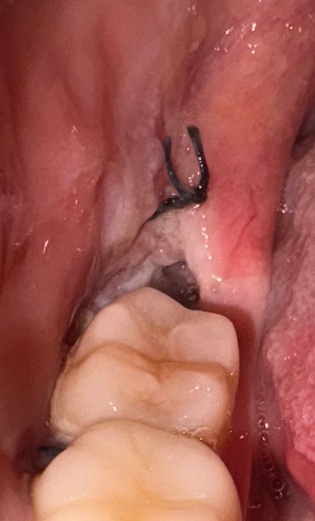 현재 시간으로 보았을 때 정상적인 회복 과정으로 보입니다. 주변 잇몸 색과 비교했을 때 정상적인 회복 패턴으로 판단되어 지며 일주일 뒤에 실밥을 제거하면 되겠습니다. 만약에 문제점이 있다면 통증이 극심하게 나타나고 붓기가 잘 가라앉지 않습니다.