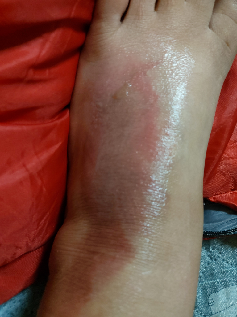 화상의 범위가 넓고, 부어오르면서 압박되는 느낌까지 동반하고 있습니다. 더 심해지면 혈류가 차단되는 상황까지 벌어질 수 있으니 진료를 받으시는게 안전합니다. 피부과에서도 화상 진료가 가능하겠으니 방문해보시기 바랍니다.