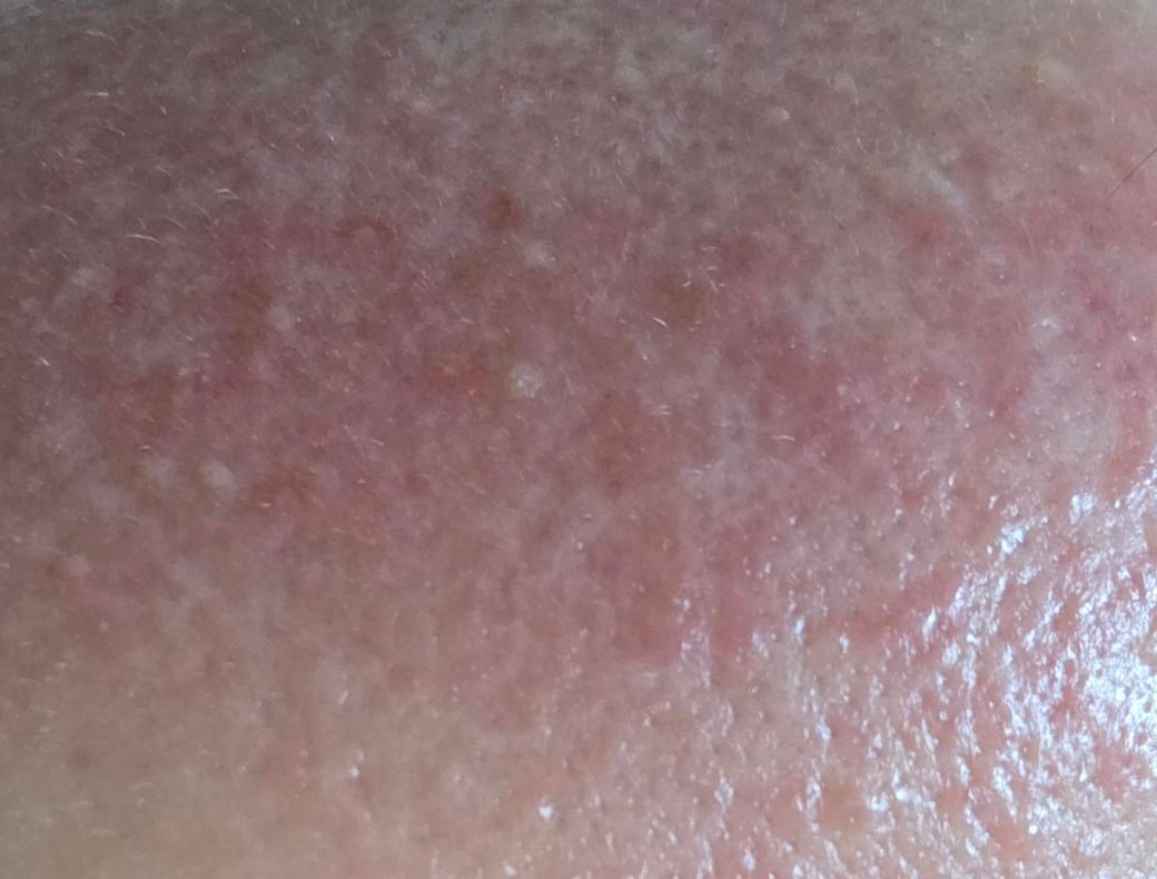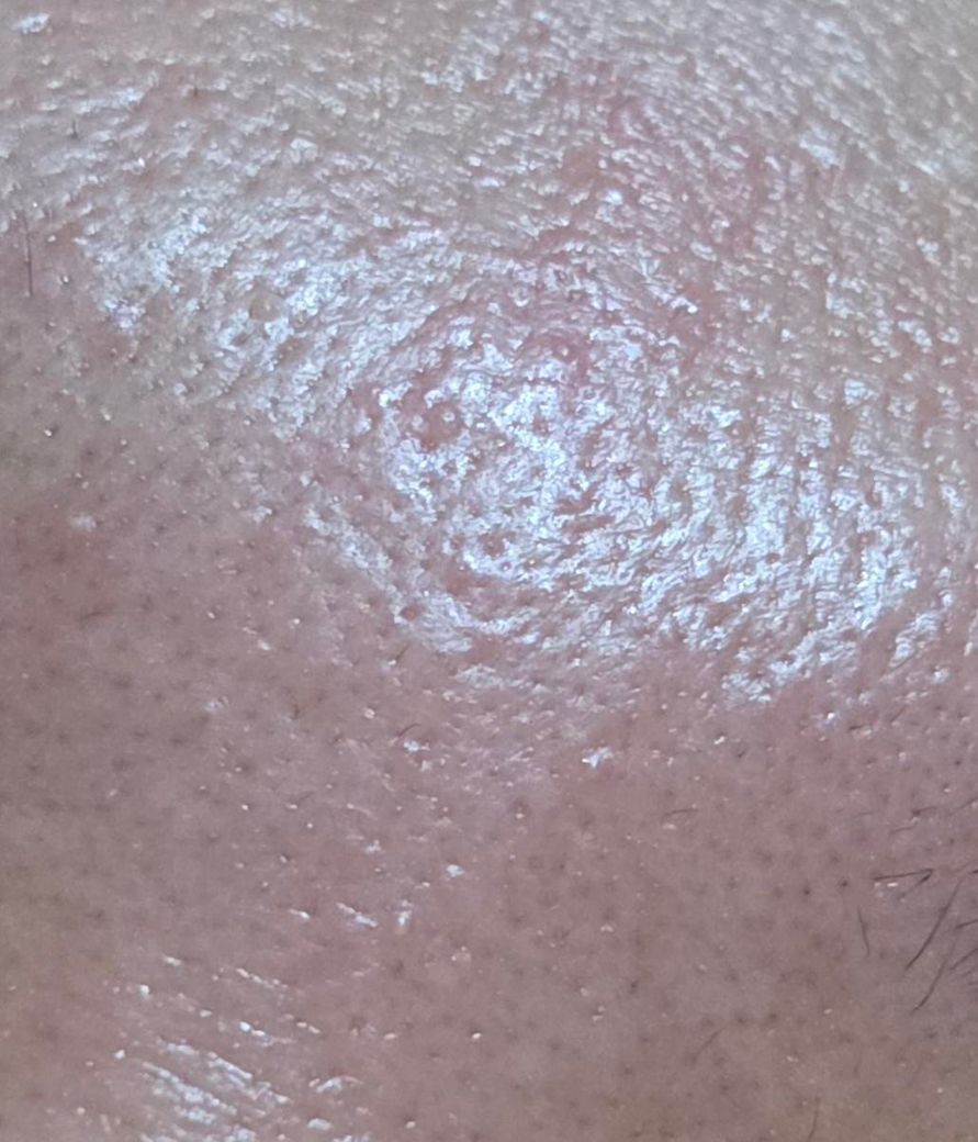 현재 보이는 특징은 양볼 중심 대칭성 분포, 미간까지 확산, 홍조와 함께 미세한 구진 형태의 오돌토돌한 병변, 열감이나 자극 시 악화, 전반적인 건조와 피부 장벽 손상 소견입니다. 또한 초기 가려움과 미세한 물집처럼 보이는 병변은 염증성 반응이 동반된 경우 설명 가능합니다.
