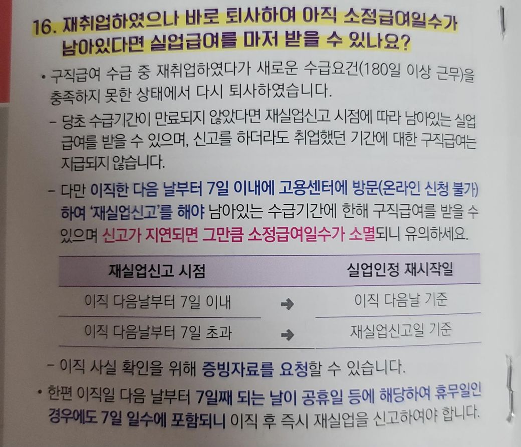2.65세 이상은 재취업시 고용보험 가입이 안되는 걸로 아는데 저희 어머니의 경우처럼 재실업신고 후 재수급이 65세이상도 가능한건지 궁금합니다. 위 내용 중 새로운 수급요건을 충족하지 못한 상태(새직장에서 고용보험 가입한지 180일 이내)라고 조건이 적혀있어서 좀 헷갈려서요.