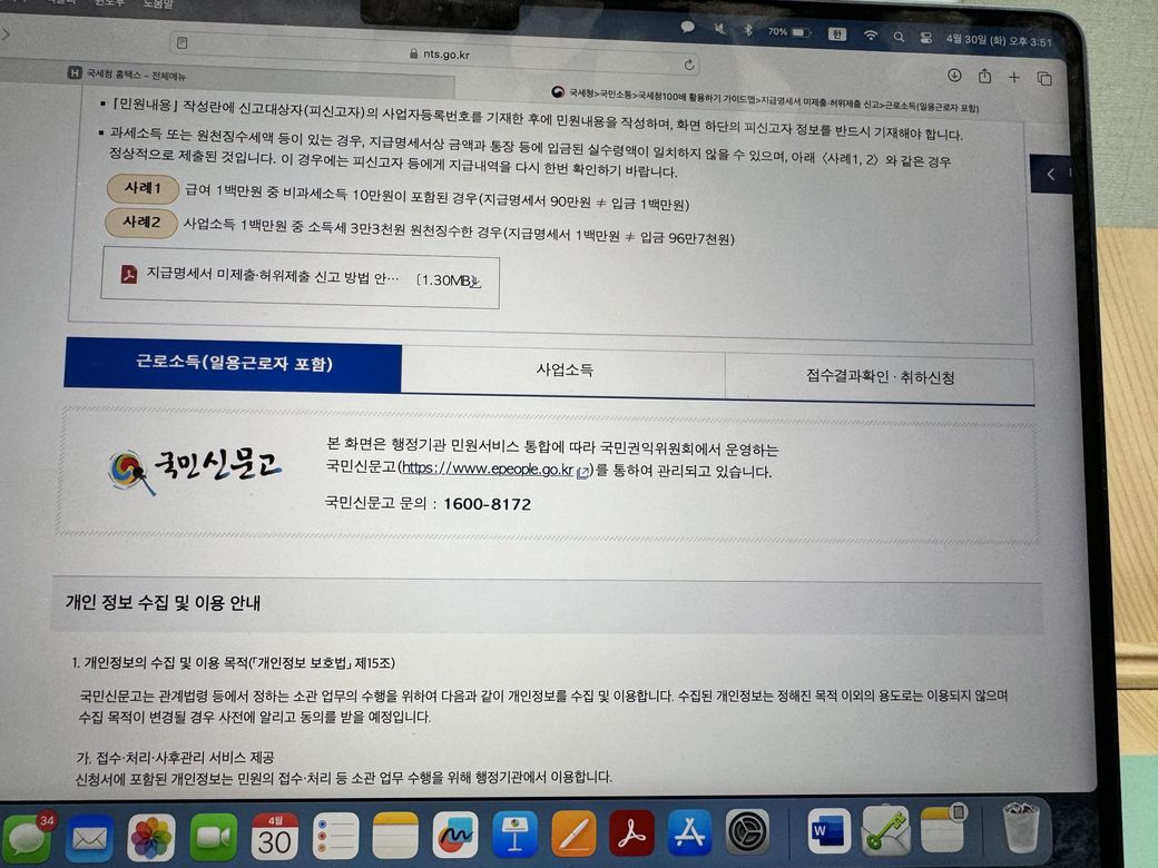 ✅국세청 담당자(사업장지역 관할 청) 쪽은 일단 소득금액이 맞으니까(실제로 통장에 찍힌 금액이랑 세금공제액 포함 맞아요) 부인신고를 하지 말고 [지급명세서 미제출신고]쪽으로 말씀하시더라구요. 해당 메뉴 내용 보니까 아래와 같기도 했고요.