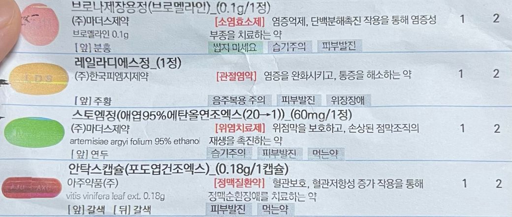 발등과 발뒷꿈치 통증으로 위의 처방약을 복용 중이며 물리치료, 전기치료와 레이저치료를 매일 받고 있습니다.