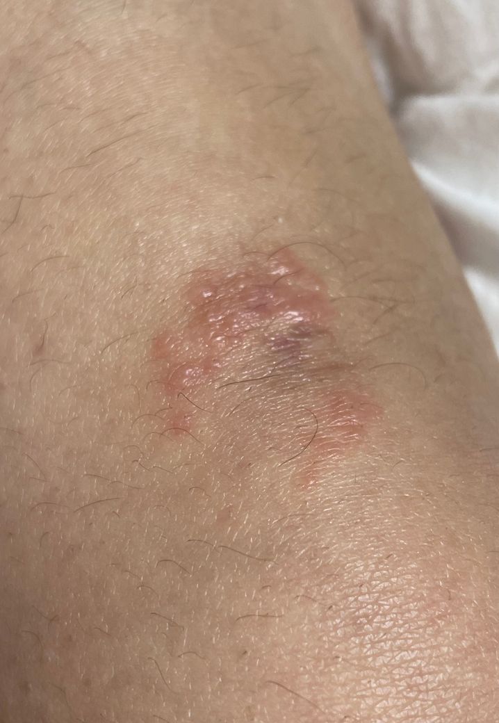 한 일주일전부터 사진처럼 왼쪽 무릎에 엄청 간지러운 두드러기? 수포?가 생겼는데 그냥 나아지겠지~하고 긁다가 안나아지길래 어제부터 집에있는 더모타손이나 에스로반 바르고있는데도 간지럽네요..연휴라 병원 못가는데 집에서 자가치료 가능한건가요? 이게 어떤 증상인지 궁금해요..