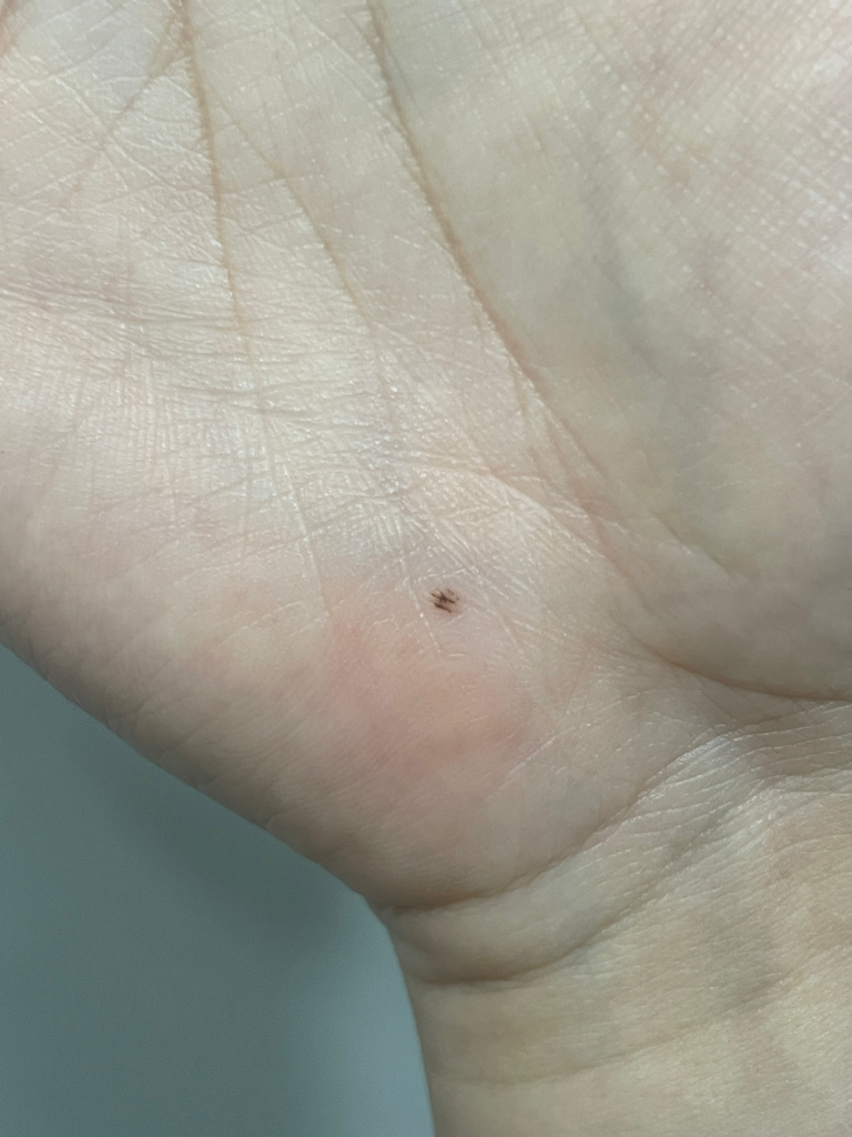 손바닥에 생긴 점의 모습이 악성을 시사하는 것으로 보이지는 않지만, 우리나라에 드물게 발생하는 흑색종의 대부분은 손, 발바닥에 발생합니다. 그러니 가까운 피부과를 방문해 진찰받아보시는 것이 안전하겠습니다.