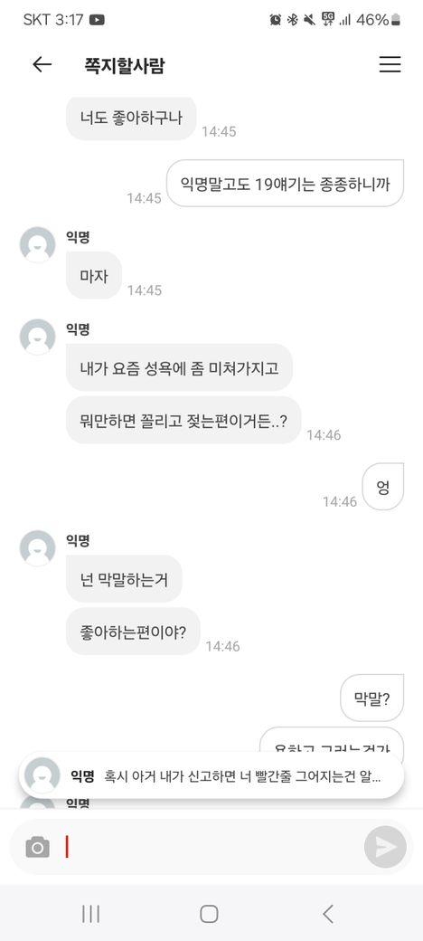 느꼈다며 이거 신고하면 너 빨간줄 그인다고 하는데