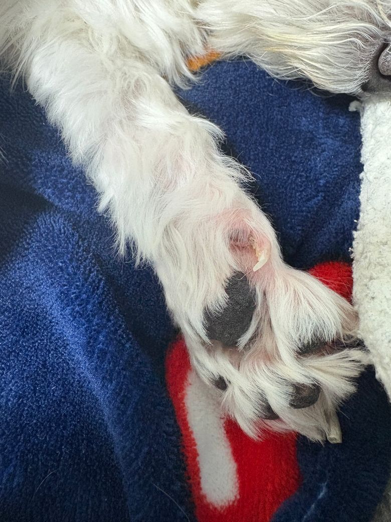강아지 옆 발바닥 색깔이 원래 나머지 발바닥처럼 검은색이었는데 오늘 확인해보니 위에 4개랑 중간에 있는 큰 거는 그대로인데 옆에 작은 것만 핑크색으로 바뀌어있어요 몸에 무슨 문제가 있는 건가요?