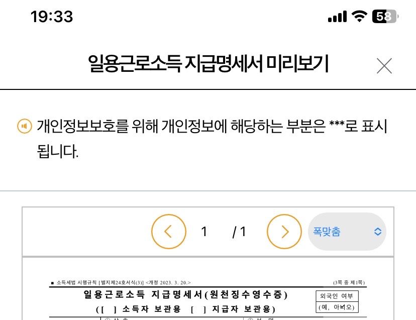 사진처럼 원천징수영수증? 으로 월급 명세서가 들어옵니다