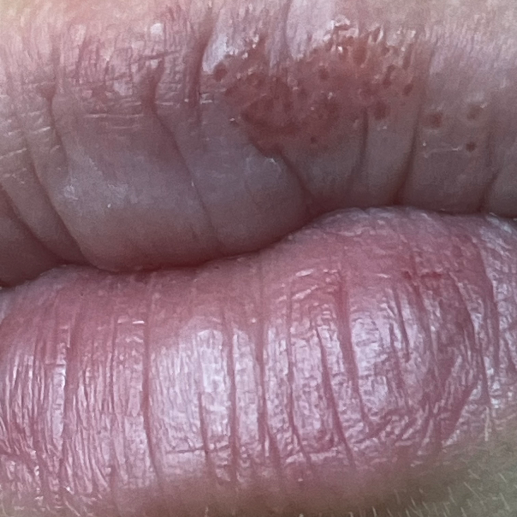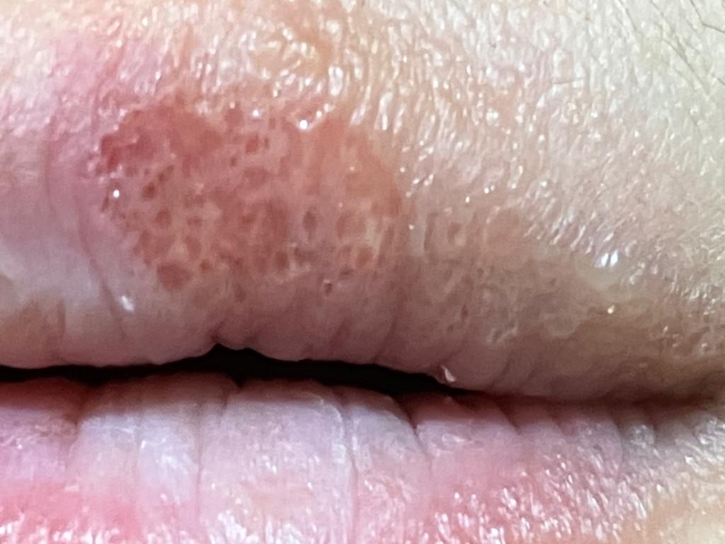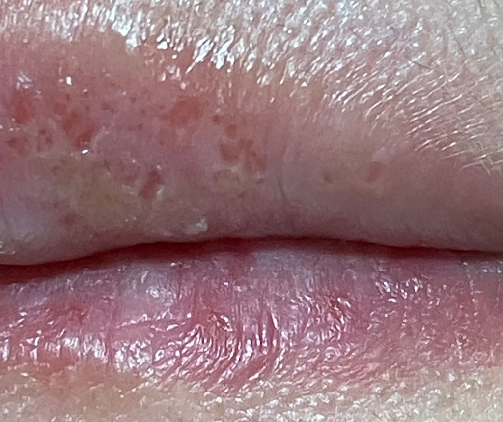 생리가 시작되자 또다시 노란색 진물딱지가 붙어있길래 떼내고 찍은 사진입니다. 윗입술만 증상이 나타났고, 아랫입술은 전날에 입술을 뜯어서 저래 된건데 피부과에서는 대충 쓱 보시더니 전체적으로 단순 입술 습진이라며 데소나크림을 처방해주셨습니다. 찾아보니 스테로이드성이라 바이러스성에는 바르면 안 된다 하길래 혹시몰라 바르지 않고 방치해두었습니다.