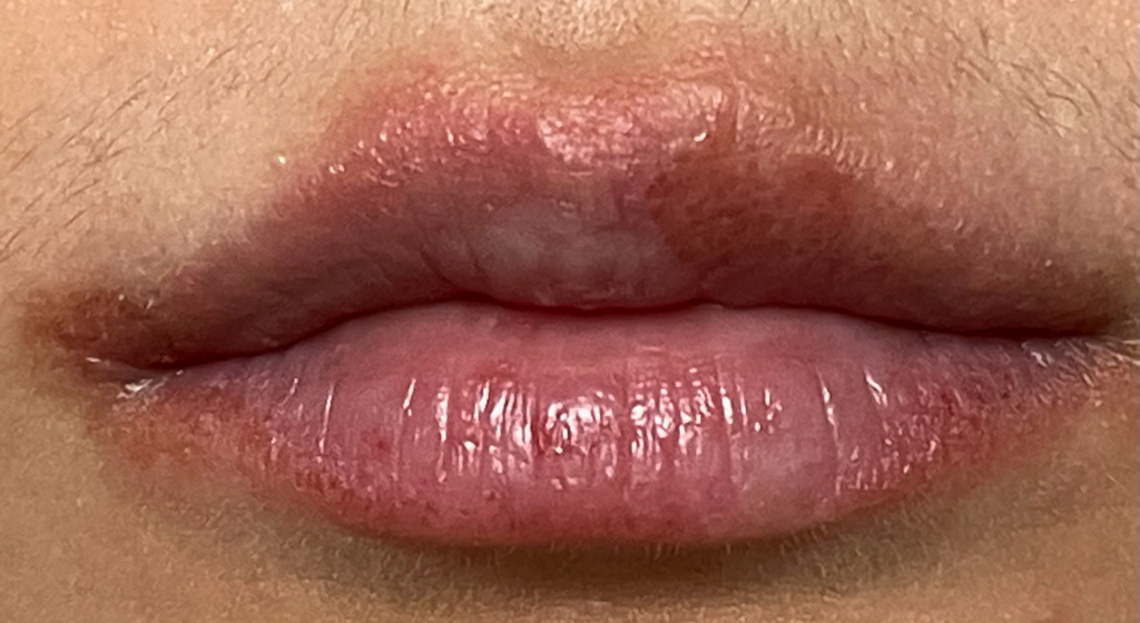 전날 밤 바세린 립밤을 바르고 잤더니 또다시 진물딱지가 있었습니다. 전날에 비해 부위가 더 넓어졌습니다.