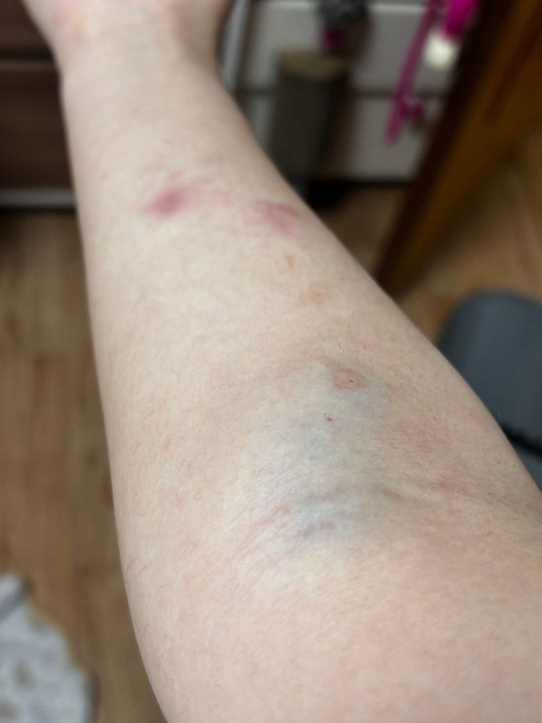 링거를 맞고 나서 정맥이 손상되면서 피하출혈이 발생한 것으로 보입니다.