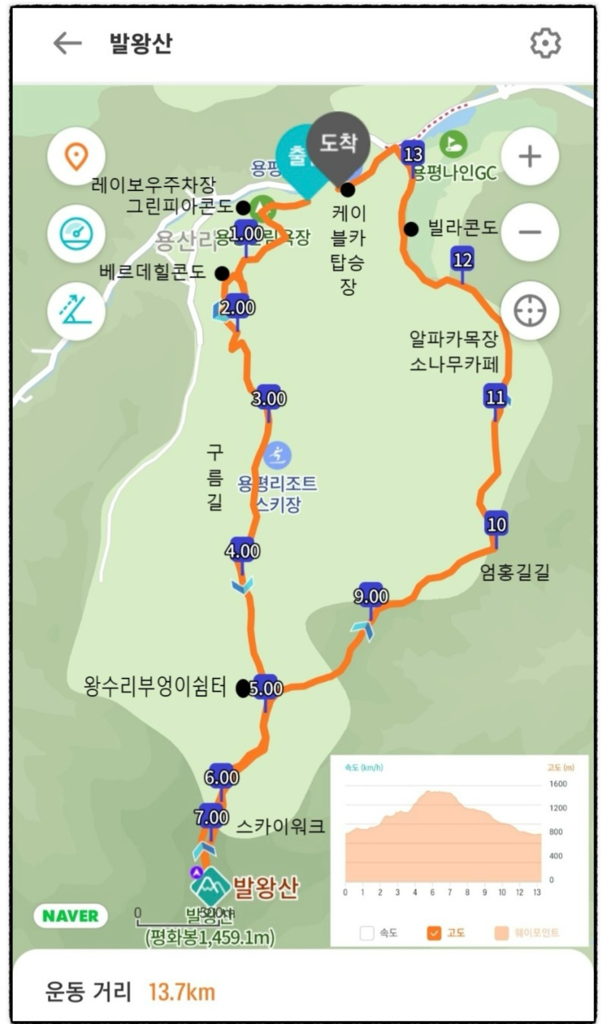 용평리조트의 드래곤벨리에서 출발하여 정상인 평화봉까지 이어지는 코스입니다. 총 거리는 3.5km, 소요 시간은 약 2시간입니다.