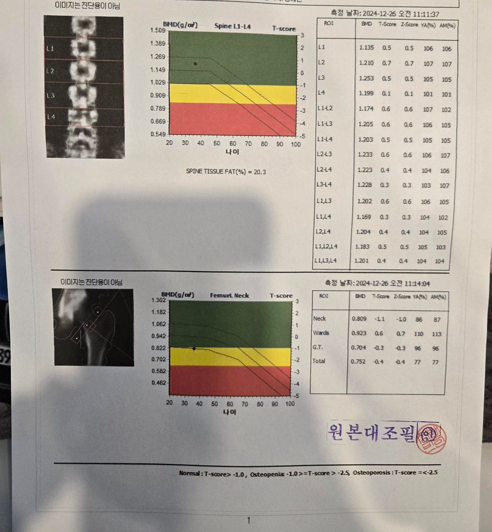 병원에서는 -1.1이라 골감소증 수치라고 들은 것만 기억이나서요...