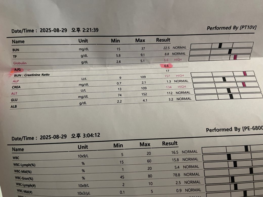 고양이 중성화하러 병원에 갔는데 흥분했는지는 몰라도 약간 미열 (39.9도)에 A/g 수치가 0.6이라고 수술을 안시켰습니다.