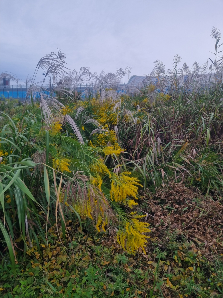 갈대잎이 하얗게 피어 가을바람에 한들한들 가을을 즐기고 이습니다. 그 가운데 노란꽃 이름모를 꽃들도 같이 어울려 춤을 추고 있습니다, 이 이름모를 고운 꽃은 무슨 꽃인가요. 줄기는 싸리나무 같기도 한데요.