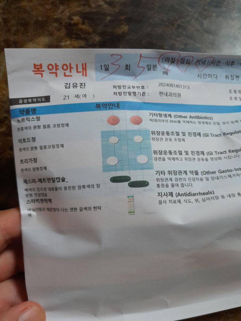 장염으로 처방받으신 노르믹스정, 이토드정, 트리가정, 제스라-제트연질캡슐, 스타빅현탁액을 복용하시면서 추가로 가지고 계신 제품을 복용하실 수 있습니다
