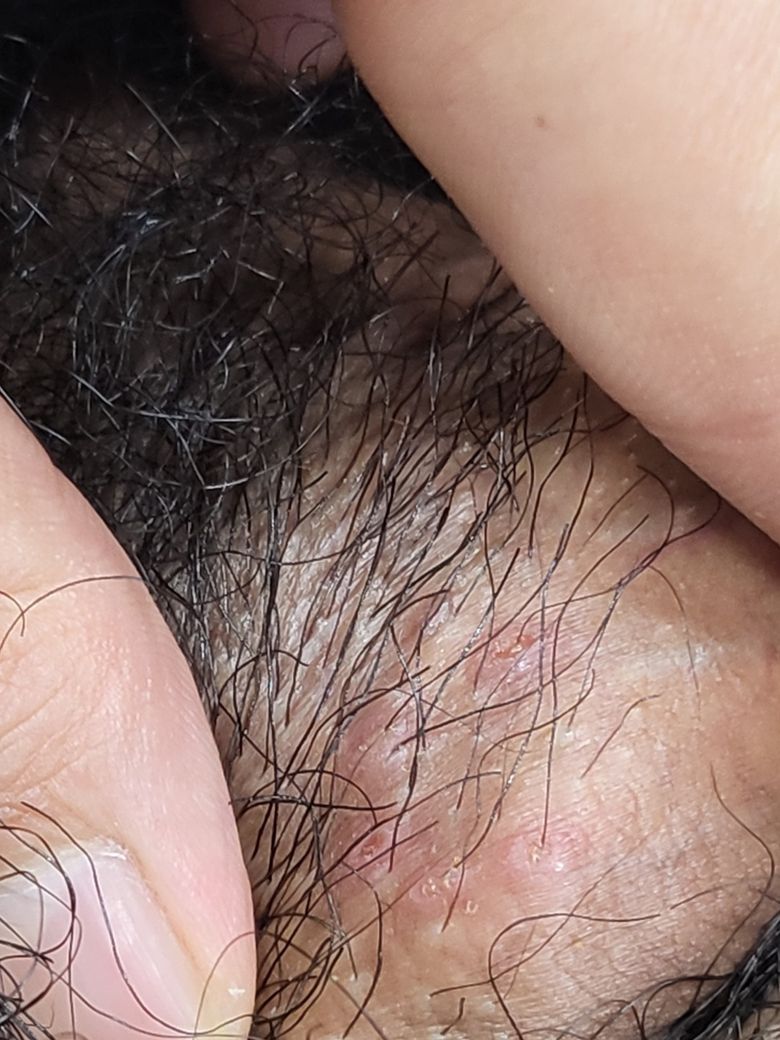 현재 병변은 성기부위 헤르페스를 감별하는 것이 좋겠습니다. 그러므로 비뇨기과에 내원하시어 진료를 받아보시는 것이 좋겠습니다.