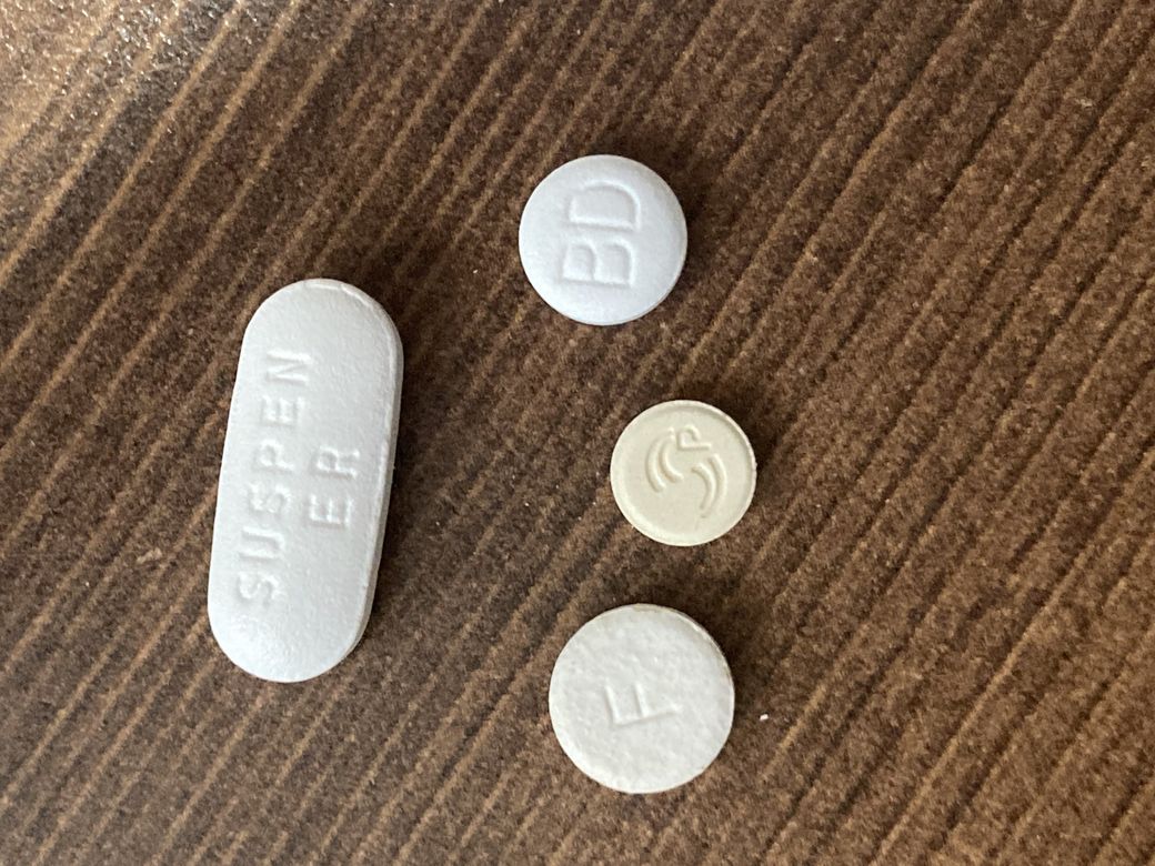 왼쪽의 큰 알약은 써스펜8시간이알서방정으로 알약을 부숴서 먹는 경우 특수형태가 깨지므로 부숴서 복용하면 안됩니다. 오른쪽의 다른 약들은 식별이 불가능해 말씀드리기 어렵습니다.