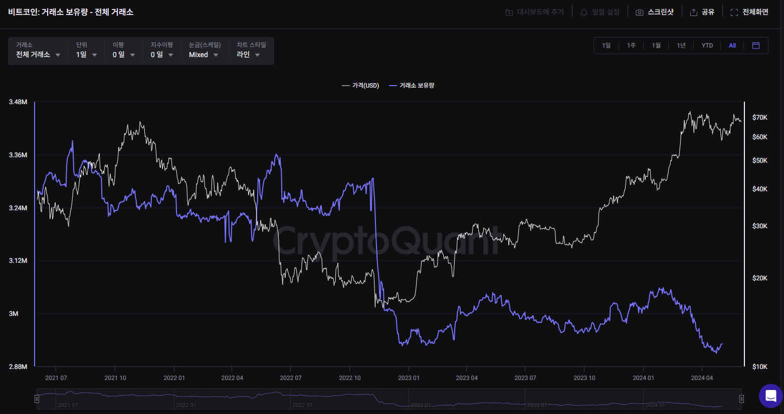 비트코인도 그런식으로 사람들이 빼가서 지금 추세적으로 계속 거래가능한 거래소 비트코인 물량이 줄어들고 있는 상황입니다.