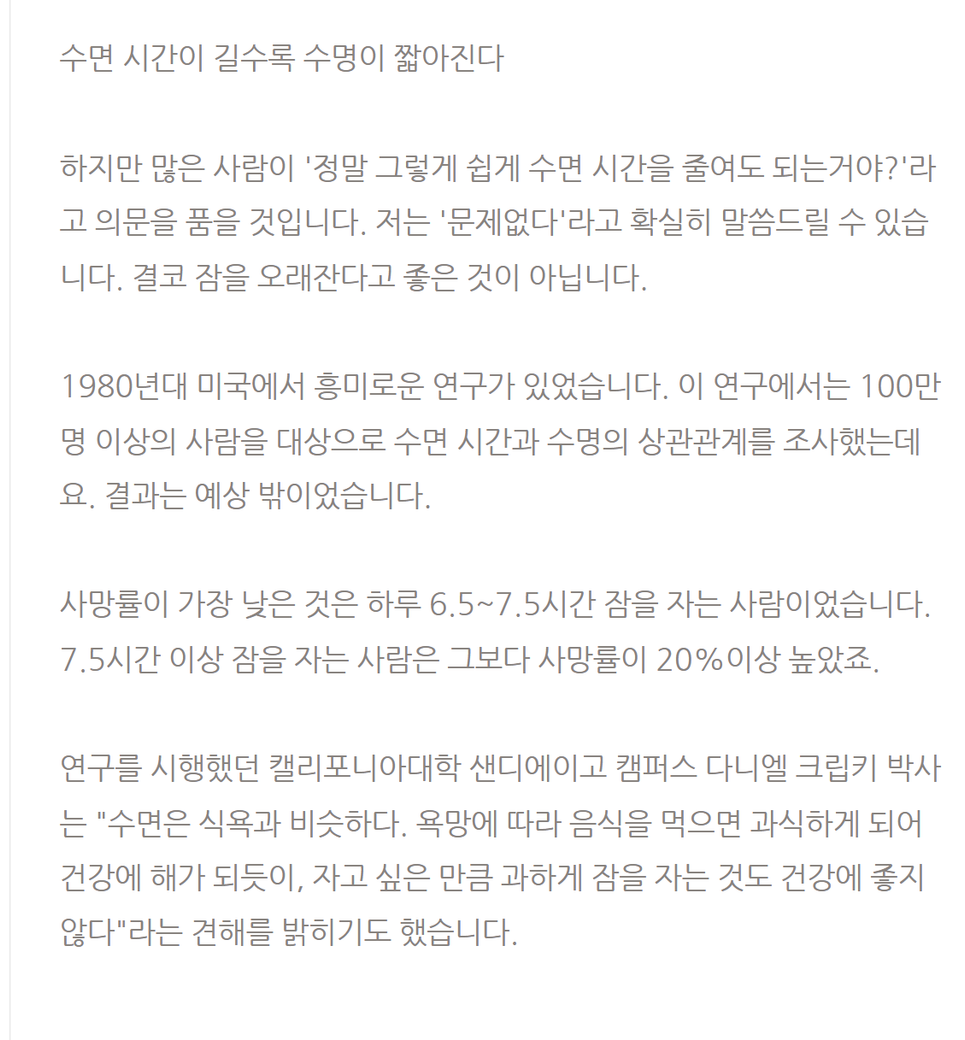 그 책에서 나왔던 본문 캡처 해왔습니다. 1980년대에 미국에서 실험을 한 결과 잠을 7.5 이상 보다 많이 잔 사람은 사망률이 20% 높았다는 결과가 있었네요