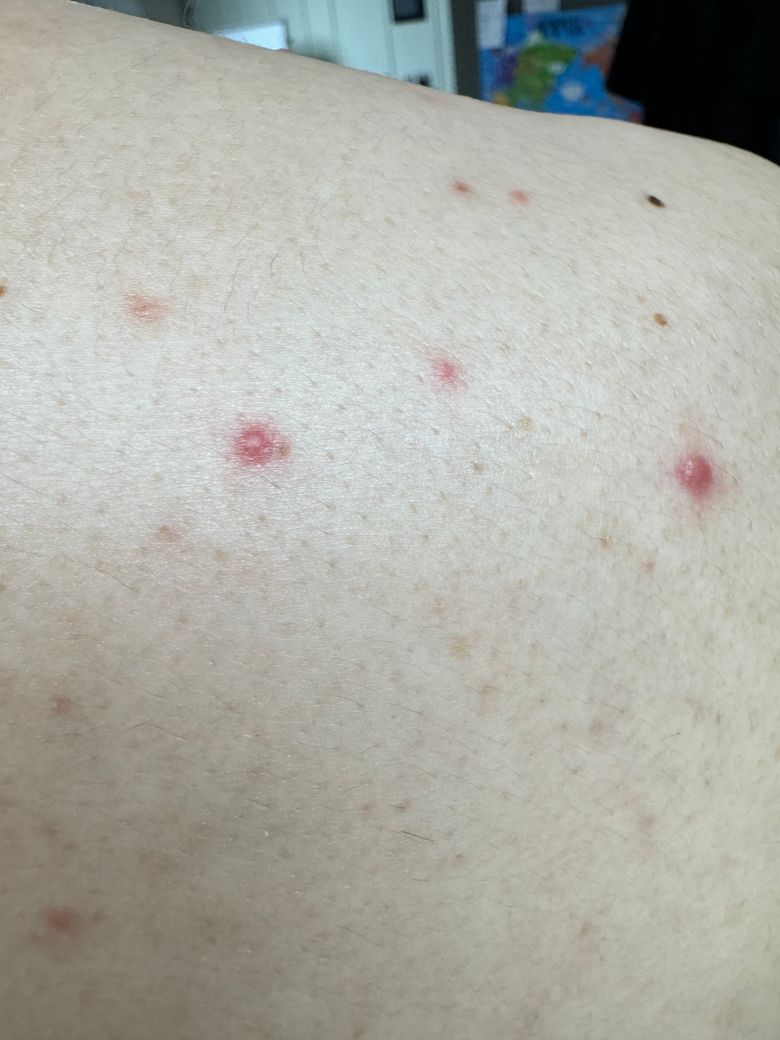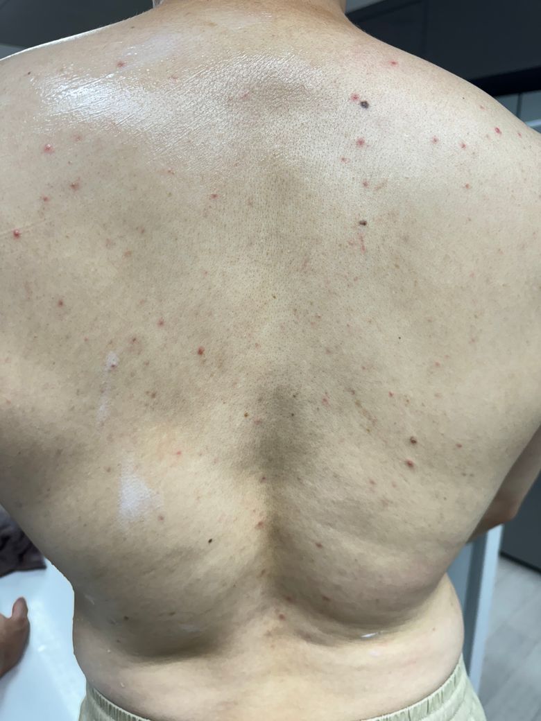 현재 사진만으로는 불충분하지만 모낭염이거나 발진성 가성혈관종증(eruptive pseudoangiomatosis)의 가능성이 있습니다.