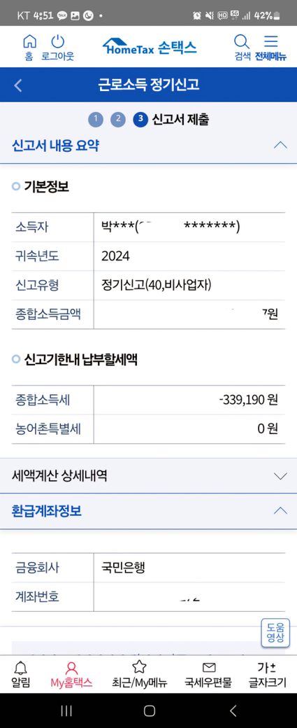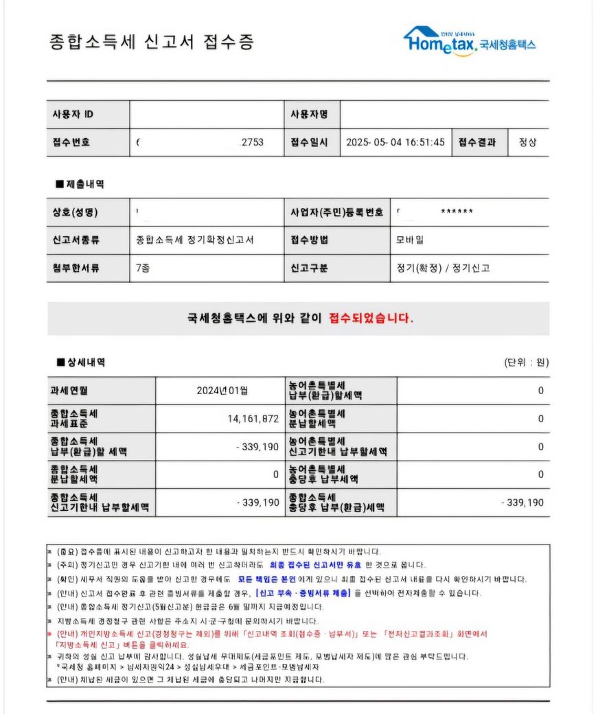 아래 접수증 사진이 종합소득세 신고를 하였다는 증거이며, 종합소득세 신고를 함으로써 339,190원을 환급 받을 수 있습니다.