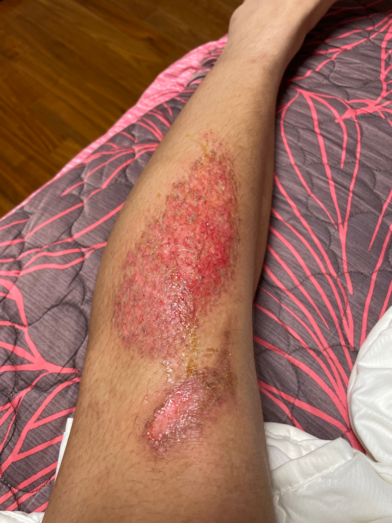아래 사진을 보았을때는 회복이 많이 된 상태로 보입니다. 이차적인 감염을 주의하시고 방수가 되는 드레싱 재료를 이용하여 상처부위가 물에 닿지 않도록 조심하시면 되겠습니다.