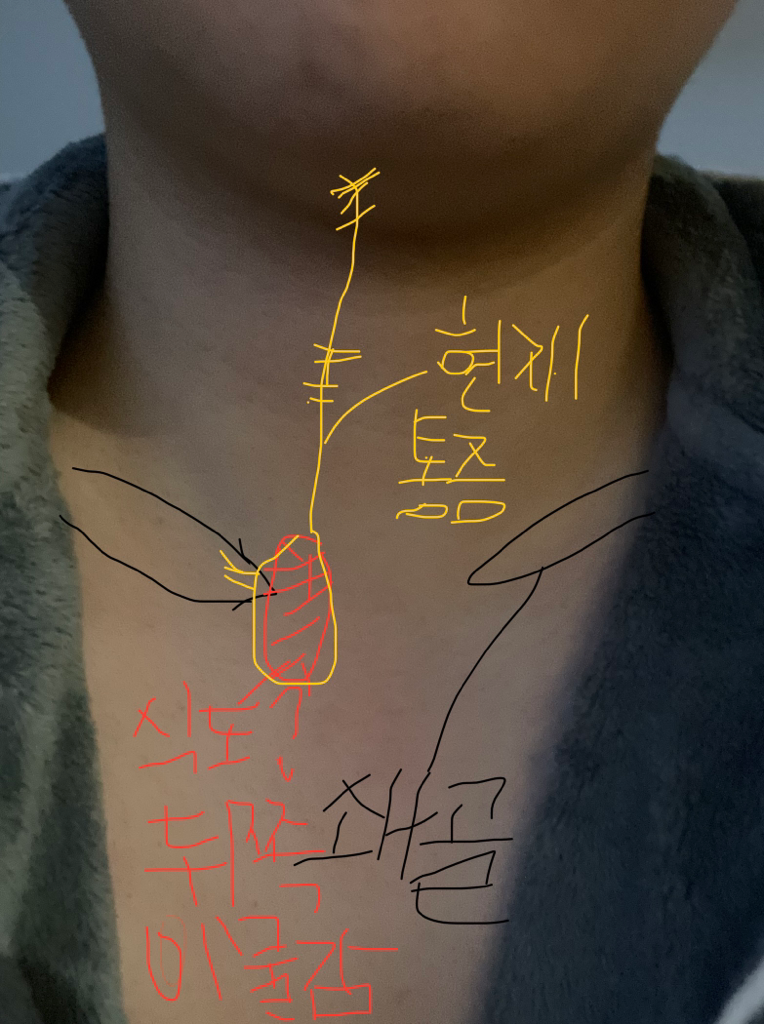 사진상으로 이물감의 부위와 통증이 어떻게 뻐치는지 표시해 놓았습니다. 이물감의 위치가 후두인지 식도인지도 알고 싶습니다. 고맙습니다.
