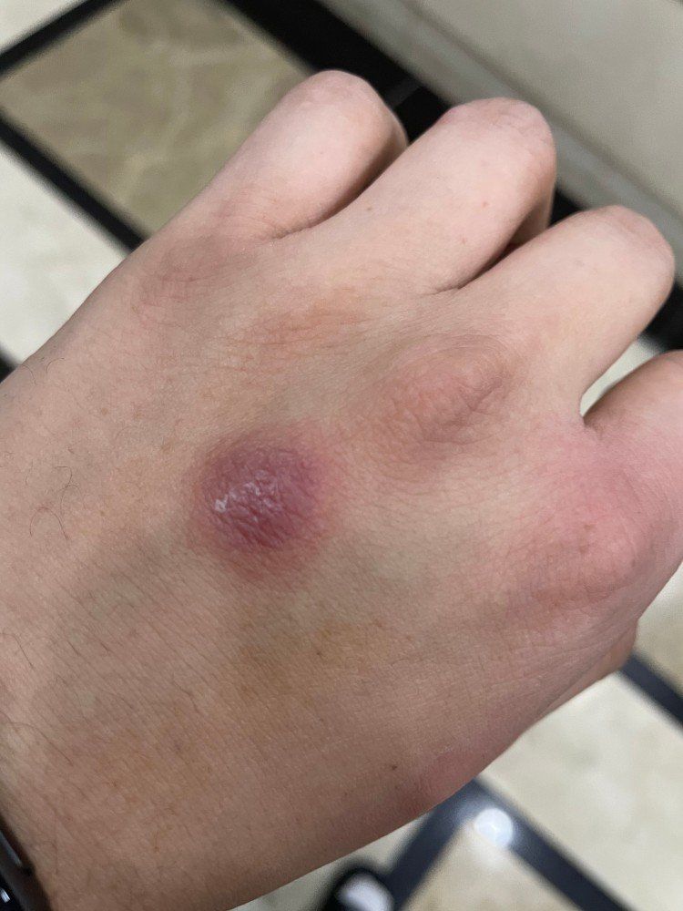 현재 원형상 반점이 확인되고 있으며 이와 같은 발진은 최근 바이러스 감염, 약물 알러지, 알러성 피부염, 벌레 물림등에서 다양하게 발생할 수 있어 피부과에 내원하시어 진료를 받아보시는 것이 좋겠습니다.