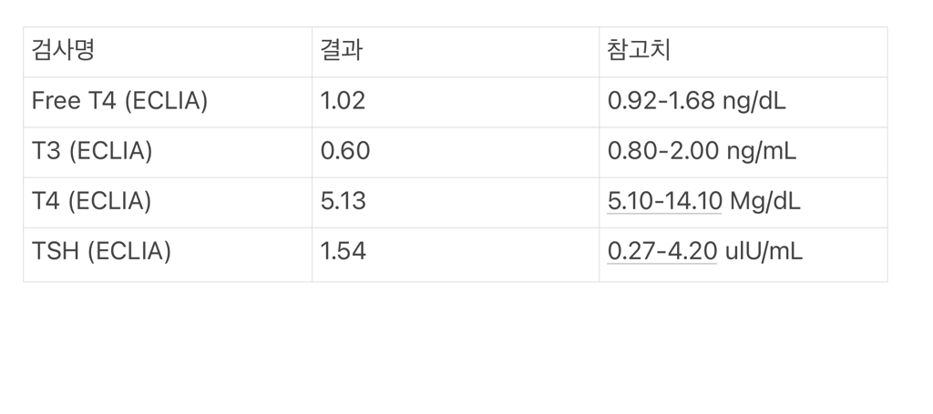 갑상선 호르몬 수치에 대해 궁금하시군요. 호르몬 검사 중 유리 T4(free T4)와 TSH가 가장 중요한 검사값인데, 이 수치가 정상범주에 있으니 저하증이라고 보기는 어렵습니다. T3, T4의 경우 혈액에서 단백질에 의해 운반되는데 운반단백질이 부족하거나 결합능력이 떨어지는 경우에 낮게 측정되는 경우가 있겠습니다. 따라서 이러한 결과를 해석할 때 호르몬 수치만 놓고 판단하기는 어렵고, 다른 혈액검사 결과를 함께 해석해야만 합니다.