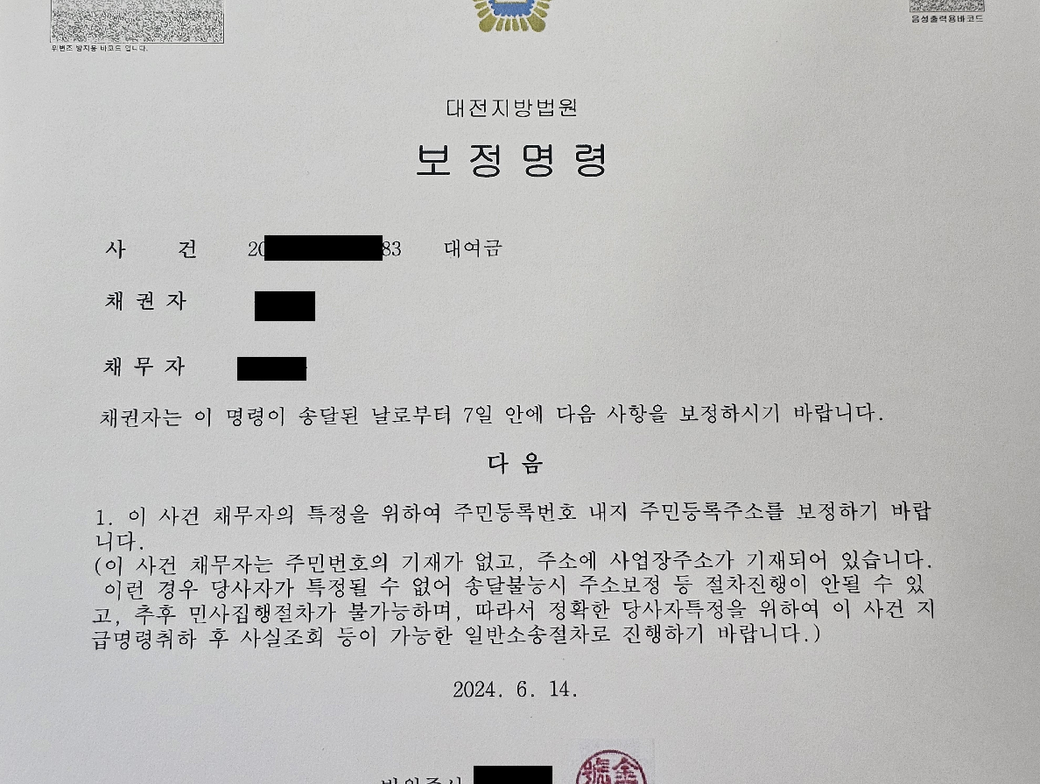 지급명령 접수 후 보정명령 어떻게 해야할까요?
