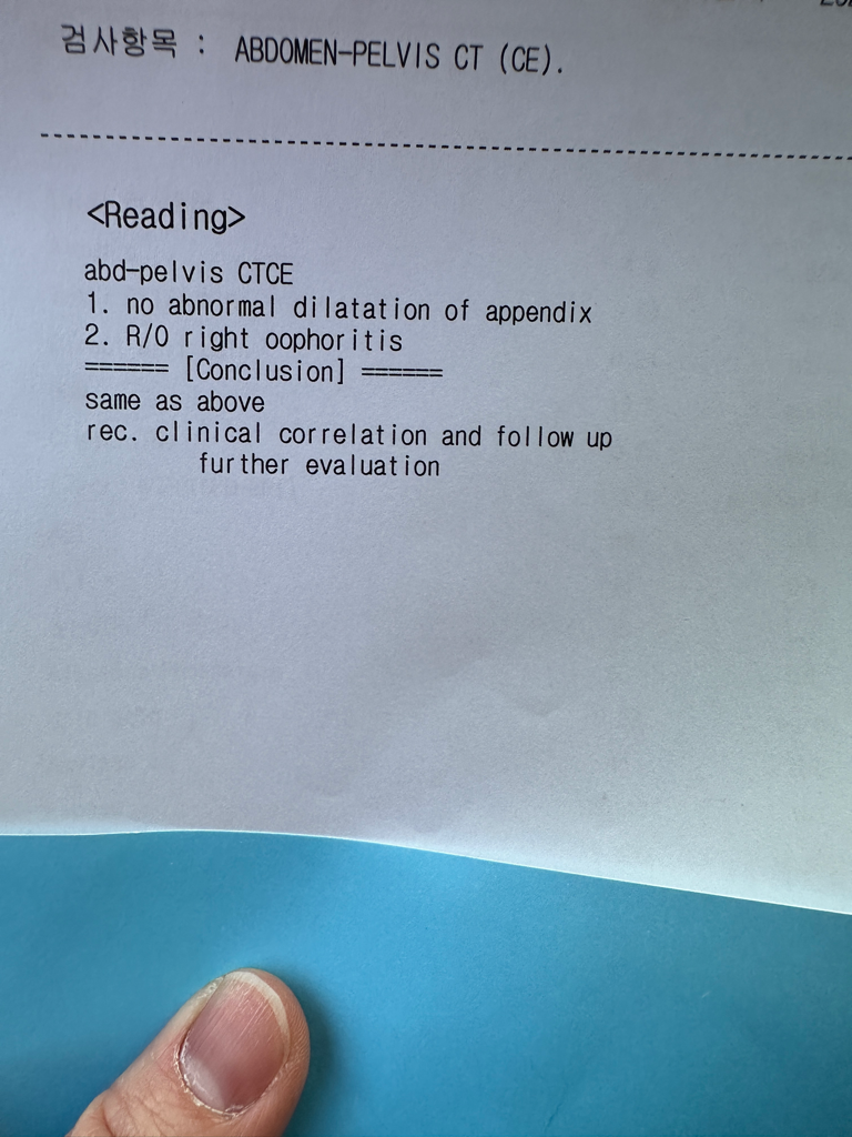 ct 정식 판독지에서 우측 난소염 가능성이 보인다고 하여 산부인과적 진료 보라고 한것 같습니다.